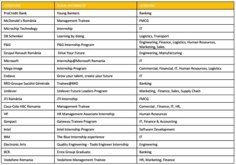 În plus, în cadrul Angajatori de TOP, tinerii vor putea aplica la peste 20 programe de internship & trainee. Printre companiile care recrutează pentru astfel de programe putem aminti: