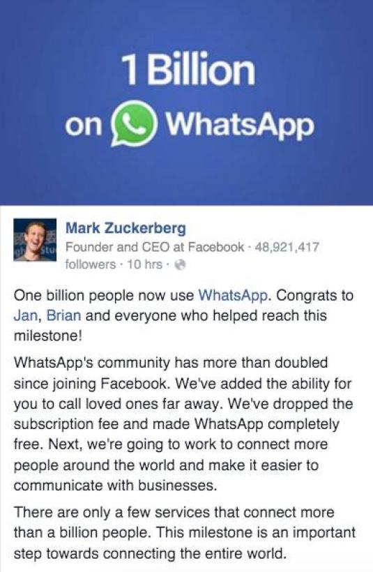 Prioritatea anunțată de Mark Zuckerberg, atunci când a preluat WhatsApp (cea mai mare achiziție derulată de rețeaua de socializare), a fost creșterea numărului de utilizatori. Înainte de a fi cumpărată de Facebook, WhatsApp avea 450 de milioane de utilizatori lunari activi. Vânzările anuale depăşeau 10 milioane de dolari, majoritatea de pe urma abonamentului anual de 0,99 dolari la care Facebook a anunţat că renunță,WhatsApp devenind un serviciu gratuit.