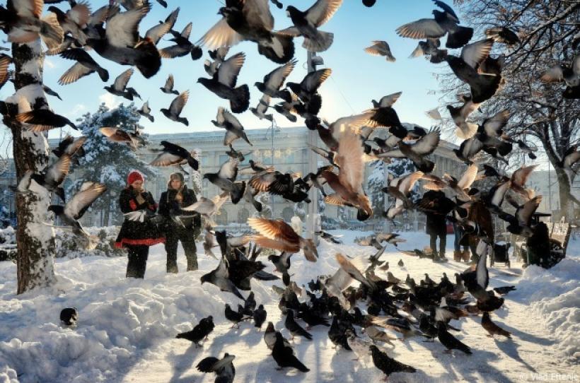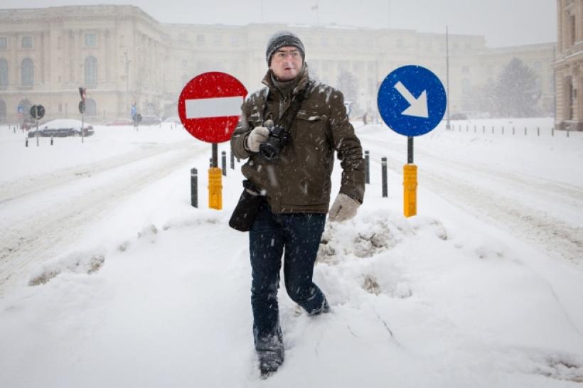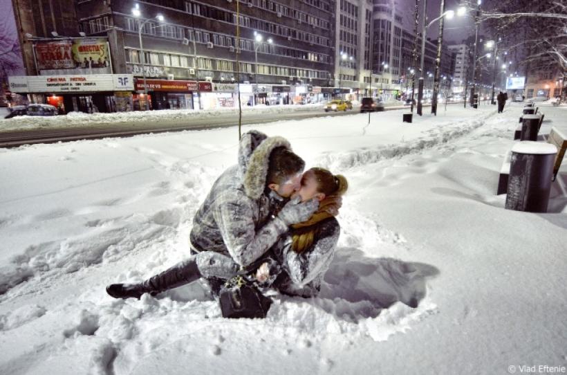 Se pare că aceste imagini fac dreptate vremii nefavorabile. Ieșirea din zona de confort este o sursă sigură pentru noi experiențe interesante. Legat de sărut, am ieșit în acele zile de iarnă în timp ce la televizor se vorbea despre „urgia albă”, era cod roșu de ninsoare și viscol. Așa a fost, am explorat două zile Bucureștiul aflat la -25˚C, a fost o experiență de neuitat. Imaginile realizate atunci au fost preluate și de diverse publicații de știri. A două zi, era duminică seară, terminasem plimbarea, eram înghețat cu totul și am zis că e momentul să intru să beau o ciocolată caldă. În timp ce mă pregăteam să traversez, pe Magheru, am zărit venind spre mine un cuplu simpatic. Cei doi se hârjoneau, se tachinau cu zăpadă, râdeau, erau foarte simpatici. Când au ajuns în dreptul meu, obosiți, au căzut în zăpadă și s-au sărutat. Am declanșat și apoi am traversat. Povestea era acolo. Acasă ajuns, am descărcat imaginea și am postat-o pe rețele. A ajuns virală imediat, s-a făcut și reportaj, în zilele următoare. A fost încununarea celor două zile de explorări înghețate.