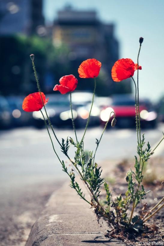Mă inspiră lumina, atmosfera unui loc. La workshopuri am deseori ocazia să demonstrez cum detalii adesea invizibile ale lumii înconjurătoare devin extraordinare, privite în lumina bună, din unghiul potrivit. Îmi atrage atenția ceea ce astăzi arată altfel decât ieri, ceva care nu se așază în ordinea firească a lucrurilor cunoscute. Am învățat să îmi ascult vocea interioară și să mă opresc acolo unde mintea sau ochiul încă nu sunt pregătite să înțeleagă sau să vadă, dar ceva din interior a vibrat deja la ceva care e acolo, undeva aproape, și așteaptă să fie descoperit. Mă bazez mult pe aceste simțuri pe care odată nu știam să le descifrez, acum sunt mereu ascuțite și mă ajută să descopăr lucruri care pot fi uimitoare, pe lângă care trece toată lumea, dar pe care nu oricine le vede. Recent am făcut asta cu o mâna de maci din mijlocul intersecției de la Piață Română. I-am zărit din autobuz, m-am uimit. Am revenit peste câteva zile și i-am pozat cu atenție, reușind să rămân în focus mental în fața mașinilor care treceau în viteză pe lângă mine. La Piața Universității, la fântână, s-a întâmplat la fel. E un loc pe care îl știu și îl parcurg zilnic de cel puțin 25 de ani. Într-o după-amiază de toamna, am aflat acolo un miracol vizual, condus fiind de razele soarelui și de niște umbre foarte grafice.