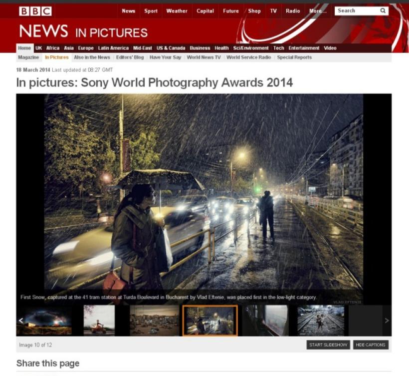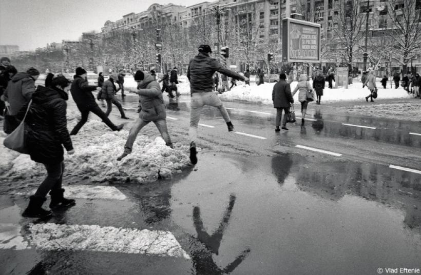 Mulți dintre voi, poate nu îi știți numele, poate nu i-ați urmărit îndeaproape creația, dar cel puțin trei dintre fotografiile lui sigur v-au trecut cel puțin o dată prin fața ochilor. Pentru că Vlad este cel care surprins și imortalizat celebrele cadre din stația tramvaiului 41 (fotografia: Prima zăpadă), de pe Bulevardul Magheru (fotografia: Sărut în zăpadă), și Bulevardul Unirii (fotografia: Sărituri olimpice peste bălți) devenite atât de virale în online, încât au ajuns subiect de reportaje media.