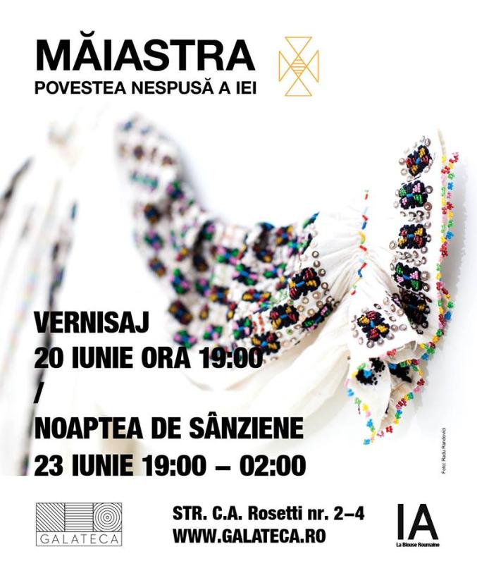 La Galeria Galateca – aflată în cadrul Bibliotecii Centrala Universitara „Carol I” – va fi vernisată expoziţia „Maiastra - Povestea nespusă a iei”. Organizată în perioada 20 iunie – 25 august, în parteneriat cu comunitatea online La Blouse Roumaine, expoziţia va dezvălui povestea iei prin legende şi tradiţii. Astfel, duminica 23 iunie, între orele 19.00 şi 02.00, vor fi reînviate tradiţii şi obiceiuri din popor, pornind de la confecţionarea de coroniţe din Sânziene şi trecând prin momente încântătoare de muzică şi proiecţii cinematografice. În expoziţie vor putea fi admirate ii de patrimoniu, fotografii ale Reginei Maria purtând costum popular, o colecţie de 200 de fotografii interbelice ale colecţionarei Beryl de Zoete, precum şi o interesantă “dare de seamă” a evoluţiei vesmântului pornind de la cultura Cucuteni până la piesele creatorilor contemporani Yves Saint Laurent, Jean Paul Gaultier şi Tom Ford.