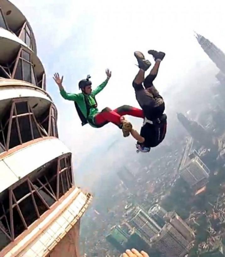 De obicei, acestei acţiuni i se mai spune şi „încercare de sinucidere”. Săritorii se aruncă de bunăvoie de pe clădiri, cu nimic altceva decât o paraşută de mână, care previne traumele căderii. În acest sport nici nu mai trebuie să ţii scorul: câştigă cel care nu moare. Pierzătorii „norocoşi” sunt cei care îşi rup tot ceea ce se poate rupe, să spunem… oasele. Între cinci şi 15 oameni au murit într-un an, lucru care îl face să fie un sport ilegal. Ceea ce e perfect de înţeles.