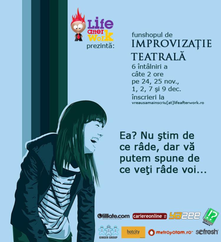 Cursul va avea loc in zilele de 24, 25 noiembrie si 1, 2, 7, 9 decembrie, intr-o locatie ce va fi anuntata pe mail participantilor. Cei care vor sa-si dezvolte creativitatea si spontaneitate sunt invitati sa se inscrie la: vreausamainscriu [at] lifeafterwork.ro.