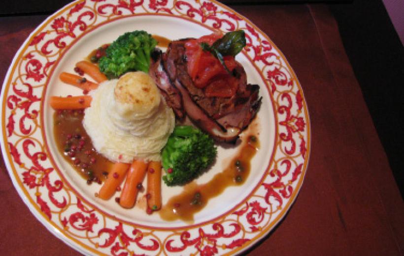 Muschiul de vita marinat cu sare, piper, cimbru, rozmarin si sage este invelit cu bacon si fript pe gratar timp de 20 de minute. Alaturi de carnea frageda si zemoasa se serveste un piure de cartofi, ornat cu brocolli, morcov, sos de piper rosu si verde.
