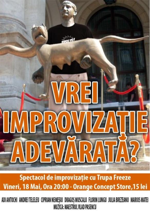 Trupa de teatru de improvizaţie Frezee înseamnă tinerii actori Adi, Andrei, Ciprian, Dragoş, Florin, Iulia şi Marius, acompaniaţi muzical de Vlad.