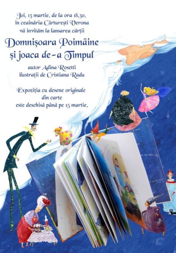 Timpul se va opri în loc şi Domnişoara Poimâine va prezenta poveşti şi vernisajul expoziției de ilustrații semnate de Cristiana Radu. Moderator va fi Nadine Vlădescu, iar din partea editurii va lua cuvântul Miruna Meiroșu, PR Manager.