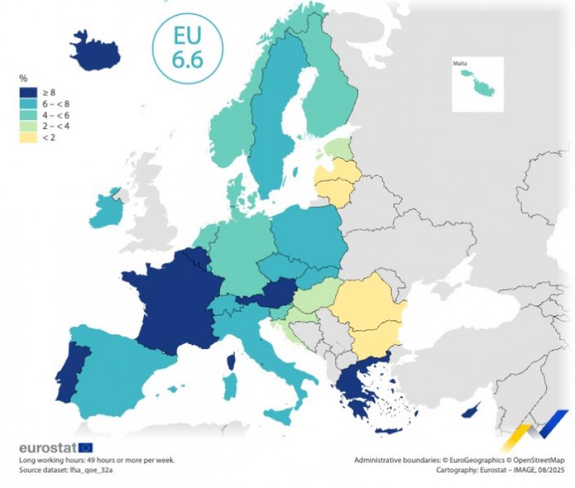 Tendința generală în Europa indică o reducere a programelor lungi de muncă, dar anumite categorii profesionale rămân expuse unor ore semnificativ mai mari. România, cu doar 1,8% dintre angajați care lucrează peste 49 de ore pe săptămână, se situează mult sub media europeană și arată un ritm de muncă mai moderat comparativ cu alte state UE.