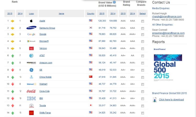 Cele cinci companii aflate pe primele locuri în clasamentul Brand Finance al celor mai valoroase mărci din lume îşi păstrează locul, dar au valori în creştere. Şi, cu excepţia sud-coreenilor de la Samsung, sunt americane (Google, Microsoft şi Verzion). Pe locul al doilea, marca Samsung a avut avut o creştere mai mică decât Apple, iar diferenţa dintre cele două este de aproape 50 de milarde de dolari.