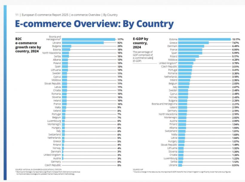 În 2025, comerțul electronic din România se apropie de 3,5% din PIB, consolidându-și astfel poziția în topul celor mai performante piețe de e-commerce din Uniunea Europeană. Potrivit raportului European E-Commerce Report 2025, România se situează pe locul 9 la nivel european și pe locul 3 în Europa Centrală și de Est, după Polonia și Cehia.