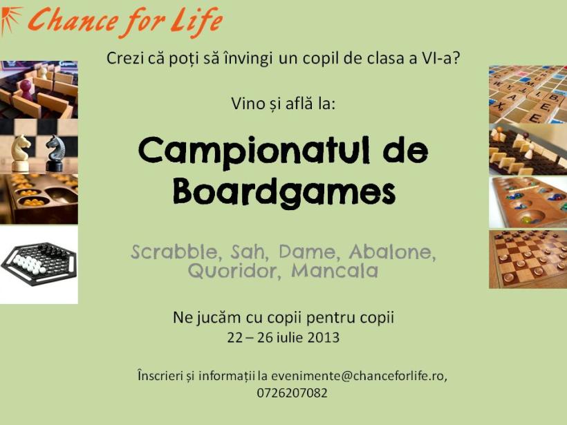 Campionatul de Boardgames se desfăşoară în perioada 22 - 26 iulie şi se adresează persoanelor care îşi doresc o pauză din rutina vieţii de zi cu zi, cărora le plac jocurile şi sunt motivaţi de provocări. Aici vor avea ocazia să retrăiască emoţia unei competiţii, jucând Scrabble, Şah, Dame, Abalone, Quoridor sau Mancala.