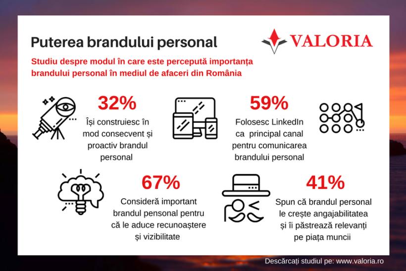 Studiul „Puterea brandului personal 2017” realizat de Valoria sondează percepțiile managerilor și directorilor executivi cu privire la importanța și beneficiile brandului personal în mediul de afaceri din România. Pentru realizarea studiului s-a folosit metoda CAWI (Computer Assisted Web Interviewing) cu eșantionare relevantă pe segmente de vârstă, la nivel de populație. Cele 1500 de răspunsuri au fost colectate în perioada 10 aprilie - 19 iunie 2017, acestea provenind preponderent de la respondenți din mediul urban cu vârsta între 18 și 55+ ani.