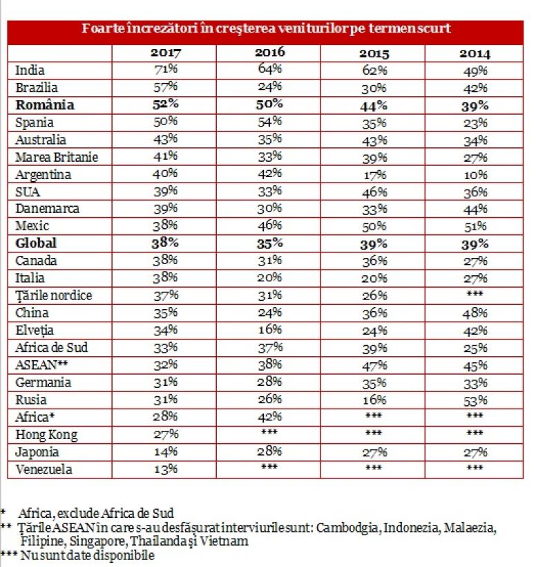Astfel, 52% dintre directorii de companii din țara noastră sunt foarte încrezători în privința creșterii veniturilor pe termen scurt, peste media la nivel global, de 38%. India conduce clasamentul cu 71%, iar la polul opus se află Hong Kong (27%), Japonia (14%) și Venezuela (13%).