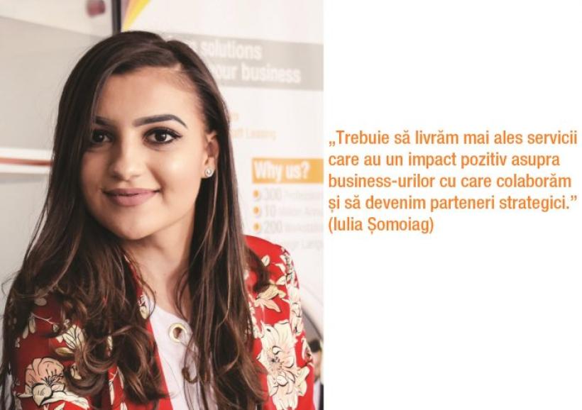 „Trebuie să livrăm mai ales servicii care au un impact pozitiv asupra business-urilor cu care colaborăm și să devenim parteneri strategici. Așadar, pe lângă costuri, clienții noștri se așteaptă la flexibilitate pentru a ne adapta nevoilor pe care ei le au, vor să fim pregătiți să facem față tuturor schimbărilor care au loc în mediul de business și să inovăm constant modul în care lucrăm. Doar astfel reușim să le oferim un avantaj competitiv. Contează și cât de evoluați suntem din punct de vedere tehnologic”, precizează Iulia Șomoiag.