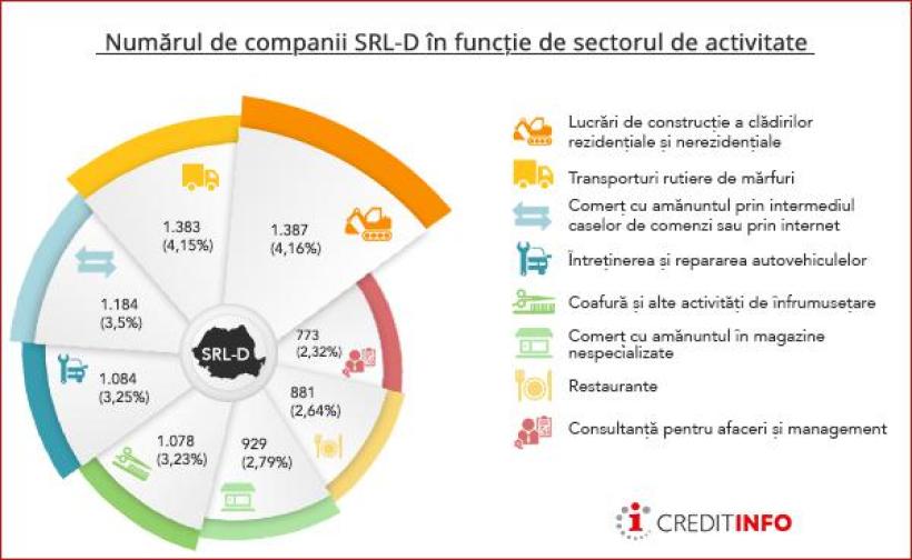 Atunci când vine vorba de firmele SRL-D care au încă activitate, cele mai multe provin din domeniile transporturi rutiere de mărfuri (1.344), construcții (1.346), comerț cu amănuntul prin intermediul caselor de comenzi sau prin internet (1.151), întreținerea și repararea autovehiculelor (1.038), coafură, activități de înfrumusețare (1.034), comerț cu amănuntul în magazine nespecializate (883), consulatanță pentru afaceri și management (848) și restaurante (750).