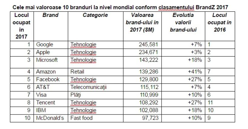 Primele 10 clasate din BrandZ în 2017 valorează aproape cât valorau, însumat, toate mărcile din Top 100 în 2006 ($1.42 trilioane vs. $1.44 trilioane) şi au crescut cu +249% ca valoare, comparativ cu creşterea de +152% a întregului clasament.