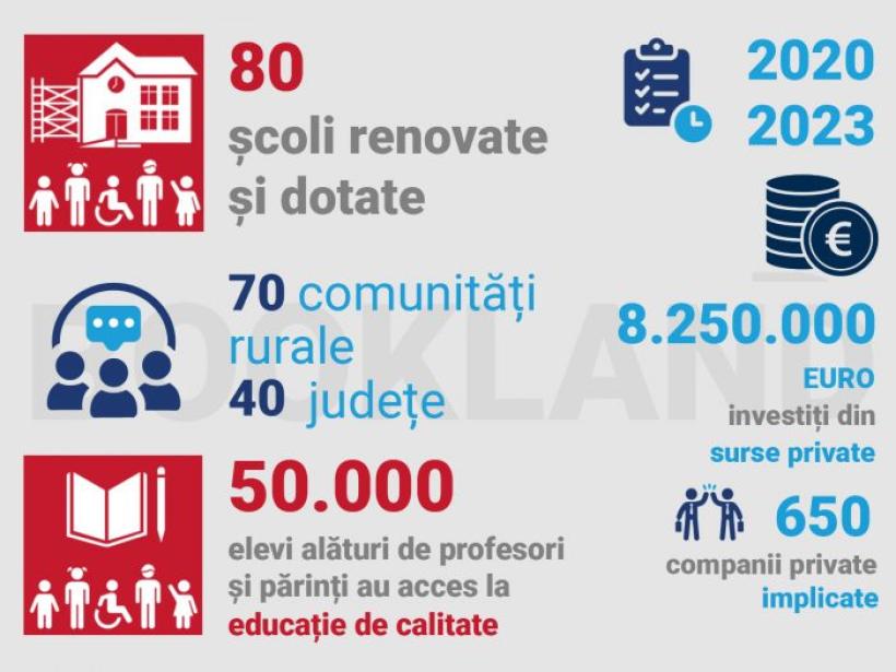 80 de școli și grădinițe modernizate și echipate în 40 de județe, 70 de comunități rurale care au beneficiat de investiții însumând peste 8 milioane EURO și peste 15.000 de copii care învață astăzi în condiții foarte bune, în clădiri dotate corespunzător. După 4 ani de la lansarea programului de renovare a școlilor din satele și comunele României, Asociația BookLand prezintă rezultatele unui demers care a dovedit că și la noi se poate – cu pasiune, muncă și prin perfecționarea unui parteneriat public-privat. Mobilizarea exemplară a asociației, care a reunit în jurul său peste 700 de companii private, 70 de primării și comunități locale (profesori, părinți și elevi), a fost recunoscută de Guvernul României ca model de bune practici și inclusă în Raportul Național Voluntar al României. Iar impactul preconizat este unul sustenabil și pe termen lung.