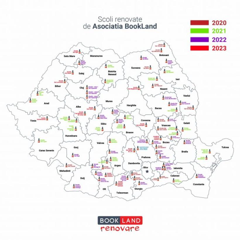 Anul 2023 a început cu noi planuri ambițioase pentru asociație. Având deja experiența a 68 de școli rurale modernizate în perioada 2020 - 2022, asociația și-a propus renovarea altor 8 instituții de învățământ din județele Alba, Bihor, Covasna, Dâmbovița, Harghita, Sălaj, Satu Mare și Timiș. Școli vechi cu clădiri insalubre, cu mucegai și igrasie, cu săli de clasă fără încălzire și lipsite de cele mai elementare condiții, acestea aveau să cunoască o transformare completă. Ulterior, lista școlilor selectate pentru renovare a fost extinsă pentru a include alte încă 4 școli și grădinițe din județele Teleorman, Olt și Buzău, toate aflate în stare avansată de degradare, ajungând la un total de 12 școli pentru care Asociația BookLand și-a asumat în 2023 renovarea integrală și dotarea clădirilor.