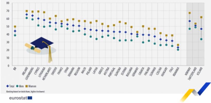 La nivel european, femeile depășesc constant bărbații în privința absolvirii studiilor superioare (49,8% față de 38,6%). România urmează aceeași tendință, conform graficului Eurostat, deși procentul general al ambelor categorii rămâne foarte scăzut.