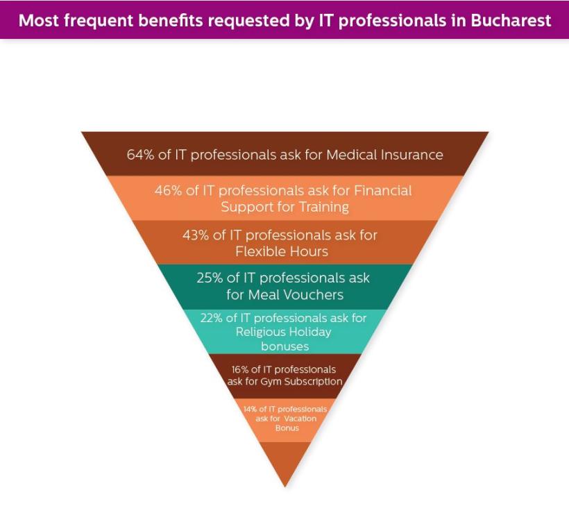 În ceea ce privește beneficiile salarile pe care aceștia le preferă, același studiu ne arată că 64% dintre profesioniștii IT optează pentru asigurare medicală privată, 43% aleg un program flexibil de muncă și doar 22% optează pentru bonusuri în bani pentru sărbătorile legale.