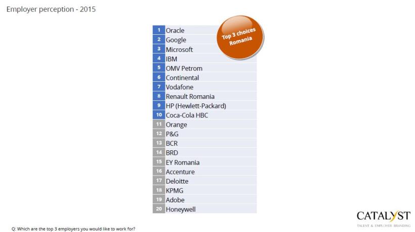 „Cei mai doriți angajatori - Most Desired Employers Survey 2015” este un studiu anual realizat, la nivel național, în perioada februarie-mai 2015, prin aplicarea unui chestionar online pe un eșantion de 12.241 de respondenți (dintre care 6.642 din București și 5.217 din restul țării). 1.429 dintre participanții la studiu nu au nicio experiență pe piața muncii, 2.106 au o experiență mai mică de șase luni la un loc de muncă, 4.158 au o experiență între șase luni și trei ani, iar 4.548 au o experiență de peste trei ani.