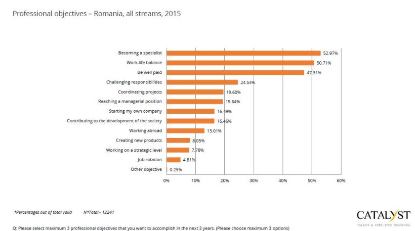Alte obiective profesionale ale tinerilor care au participat la studiul Catalyst Solutions sunt să aibă responsabilități pline de provocări (24,54%), să coordoneze proiecte (19,60%), să ajungă într-o poziție managerială (19,34%), să-și deschidă propria companie (16,49%), să contribuie la dezvoltarea societății (16,46%), să lucreze în afara țării (13,01%), să dezvolte produse noi (8,05%), să influențeze strategia de business a companiei (7,78%) și să lucreze în mai multe departamente ale companiei (4,81%).