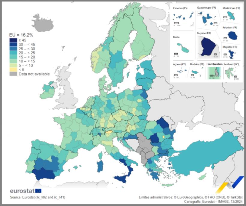 În 2023, 16,2% din populația Uniunii Europene, echivalentul a aproximativ 71,7 milioane de persoane, era expusă riscului de sărăcie, conform datelor publicate de Eurostat. Analiza riscului de sărăcie la nivel regional arată însă contraste semnificative, iar România se află în centrul acestui paradox european.