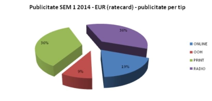 Publicitatea standard/barter reprezintă aproximativ 78% din totalul volumului de publicitate, în timp ce promovarea de produse media (presă scrisă, site-uri web, stații radio sau tv) de tip self-promotion sau cross–promotion a înregistrat aproximativ 15%. Mica publicitate constituie aproximativ 2% din totalul semestrul I 2014, iar alte tipuri de publicitate (ex: parteneriatele media, campaniile pro-bono) au însumat aprox. 5%. În ceea ce privește volumele investite în publicitate pe fiecare mediu monitorizat, presa scrisă a avut 36% din totalul volumelor monitorizate, radioul – 36%, online-ul – 19%, iar OOH – 9%.