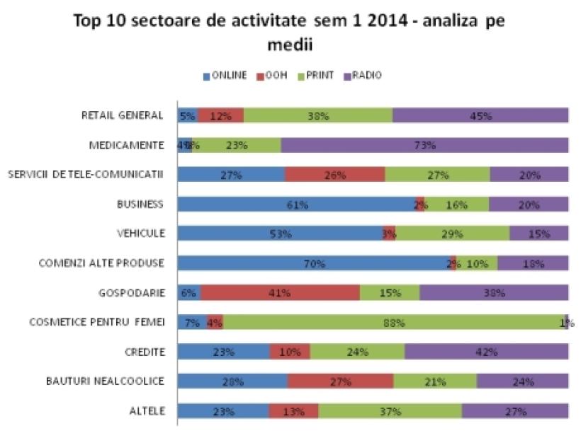 Cele mai mari volume de publicitate au fost atrase de primele 10 sectoare de activitate, respectiv 65% din volumul investițiilor. Din analiza volumelor investite pe fiecare sector de activitate pe baza mediului de comunicare în care au fost făcute investițiile în publicitate, rezultă că mașinile și magazinele online au preferat să comunice pe online, în timp ce magazinele,supermarket-urile și produsele farmaceutice au preferat comunicarea pe radio. Cosmeticele pentru femei au intrat în presa scrisă, care a atras 88% din investițiile în publicitate din acest sector.