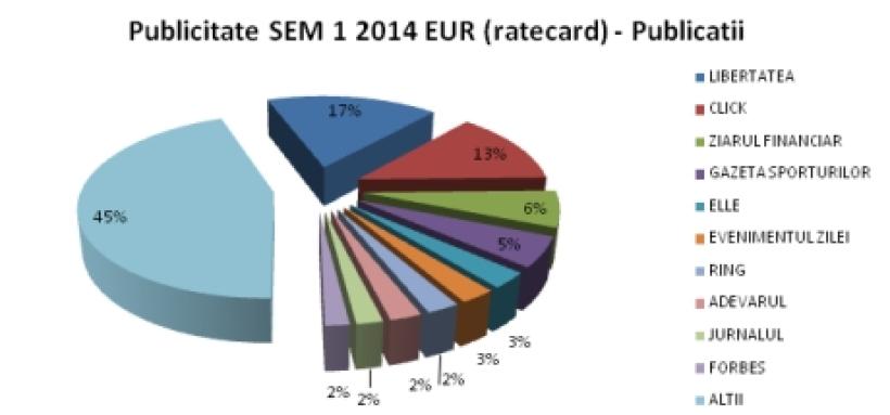 Față de perioada similară din 2013, în semestrul I 2014 observăm o creștere a volumelor de publicitate încasate de publicatiile din top 10. Cele mai mari creșteri au fost înregistrate de cotidienele Libertatea și Click - 169% și respectiv 164%.