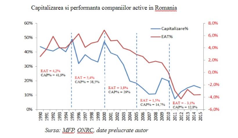 Acest fenomen a fost amplificat în mod special în anul 2016, când dividendele distribuite aferente acestui exerciţiu au fost de 43 mld RON, reprezentând 85% din profiturile obţinute în anul respectiv, aproape cât toate dividendele distribuite de întreg mediul de afaceri în perioada 2009-2015, şi 10% din capitalurile proprii ale tuturor companiilor. Analizând contextul macroeconomic local şi internaţional, nu am identificat decât un singur factor decisiv care să inducă un asemenea comportament de distribuire accelerată a dividendelor către acţionari: reducerea impozitului pe dividend de la 16% la 5% începând cu 1 ianuarie 2016. Estimez că acest fenomen al decapitalizării firmelor active în România va continua în cazul în care se va elimina impozitul pe dividend începând cu anul următor, conform celor menţionate de actualul plan de guvernare.