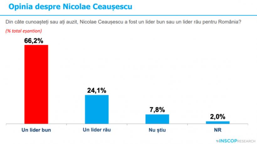 66.2% dintre români sunt de părere că Nicolae Ceaușescu a fost un lider bun pentru România, în timp ce 24.1% consideră că a fost un lider rău. 7.8% nu știu, iar 2% nu răspund.