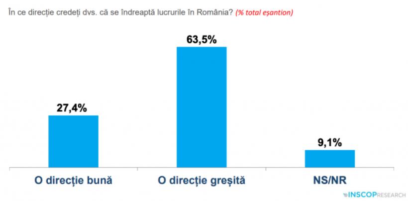 Doar 27.4% dintre români cred că lucrurile în România se îndreaptă într-o direcție bună. 63.5% sunt de părere că lucrurile merg într-o direcție greșită, iar 9.1% nu știu sau nu răspund.