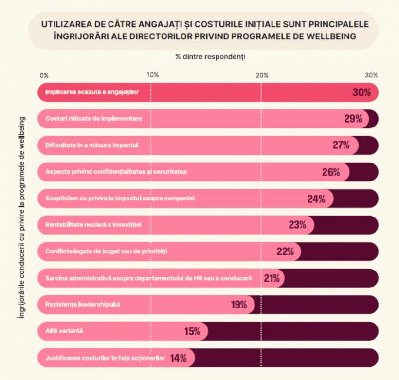 Cu toate acestea, cea mai mare provocare rămâne implicarea angajaților: 30% dintre liderii români identifică lipsa de participare activă ca principala barieră în maximizarea eficienței programelor de wellbeing.