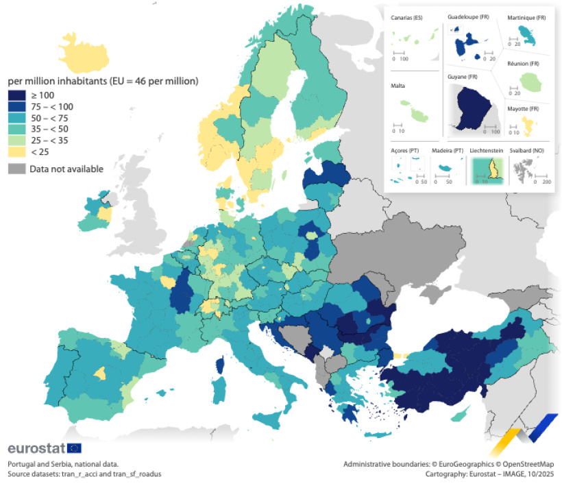 Prin comparație, media UE este de 46 de decese rutiere la un milion de locuitori, iar peste jumătate dintre regiunile europene (52,6%) se situează peste această valoare.