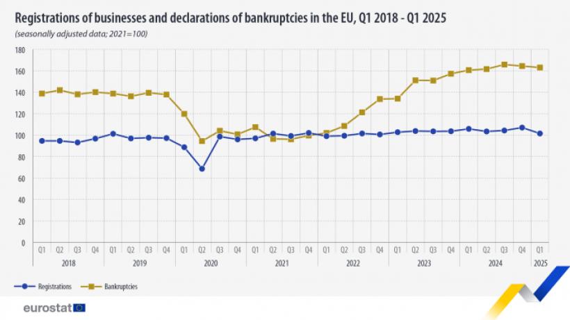 Numărul declarațiilor de faliment în rândul firmelor din Uniunea Europeană a scăzut cu 0,9% în primul trimestru al anului 2025, comparativ cu ultimul trimestru din 2024, potrivit celor mai recente date publicate de Eurostat.