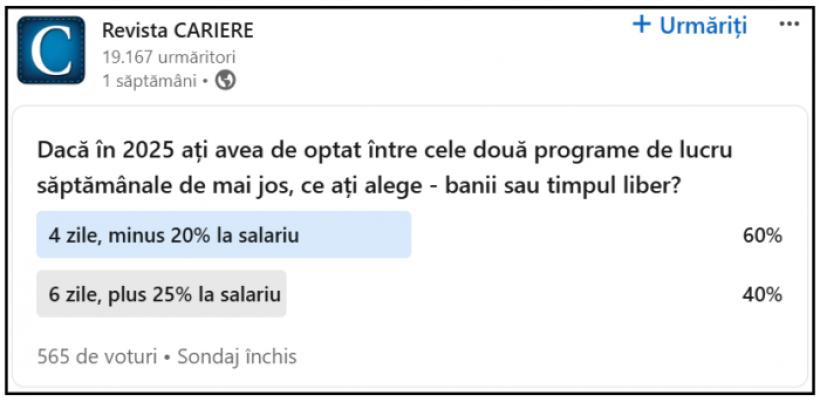 Un sondaj făcut de Revista Cariere pe pagina de LinkedIn a publicației scoate la iveală că peste 60% dintre cei care au răspuns preferă mai puține zile de lucru, pe mai puțini bani, față de mai multe zile la serviciu și un salariu mai mare. La sondaj au participat peste 500 de persoane.