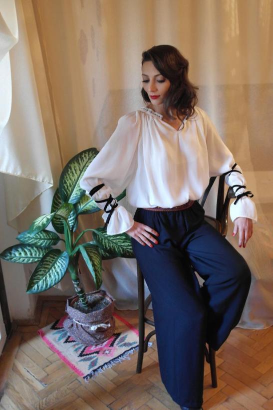 „Pe mine m-a pasionat ideea de reciclare. Şi nu atât pentru a economisi resursele, ci mai degrabă ideea de renaștere. În acest sens am făcut proiectul Miró – Rise like a Phoenix. Am găsit într-un magazin second-hand o cămașă de mătase cu imprimeu Miró, am luat-o și am transformat-o în trei rochii. Am renăscut-o, am reîncarnat-o într-o soartă mai bună. Deci mai degrabă upcycling.” La fel se-ntâmplă şi cu creaţiile ei inspirate din portul popular românesc. „E adevărat, se poartă ia, se poartă costum popular la nunți, la evenimente, este foarte frumos, este o valoare în sine. Dar nu ne putem îmbrăca tot timpul în ii, mai ales că cele vechi chiar ar trebui conservate. Am făcut rochii inspirate din portul tradiţional, dar am folosit o croială modernă. Este tot un fel de renaștere. Şi am să fac în continuare asta, pentru că frumusețea costumului popular este o sevă nesfârșită, o apă vie din care mă hrănesc cu ochii și cu sufletul.” Spune c-a citit undeva că boala acestui secol este izvorâtă din lipsa stimei de sine. Şi i s-a părut verosimil. Însă crede cu tărie că trebuie să trăim fără frică.