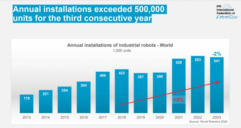 Numărul de roboți industriali instalați la nivel global a atins 541.000 de unități în 2023, ceea ce marchează al treilea an consecutiv cu peste jumătate de milion de instalări, conform raportului World Robotics 2024 al International Federation of Robotics (IFR).