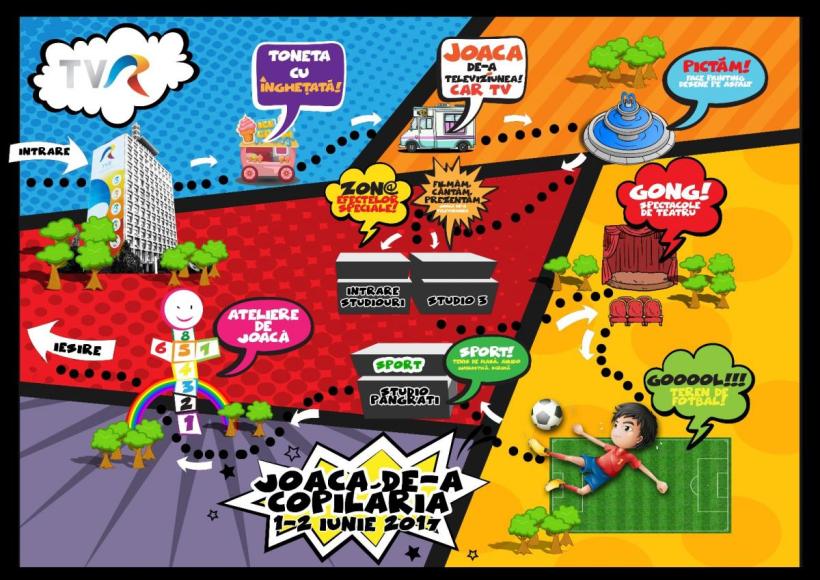 Cele nouă atracţii sunt: Zona de întâlnire. Toneta de îngheţată; Zona de Contact TV, Zona La Fântână – “Stop se pictează” (face-panting, desene pe asfalt); Zona@ Efectelor speciale; Zona Studioul 3, unde filmăm, cântăm şi prezentăm; Zona Teatru în TVR; Zona Teren de Fotbal; Zona Studio Pangrati; Zona Ateliere de Joacă.