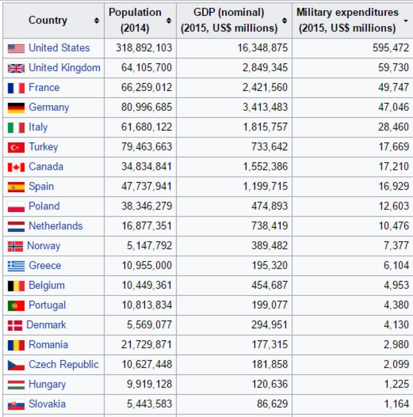 În aceste condiții, americanii au tot dreptul să-și manifeste nemulțumirea, mai ales că ei contribuie la bugetul NATO cu o sumă de peste 10 ori mai mare decât cheltuielile următoarei țări – Marea Britanie. În 2015, țări precum Canada, Belgia, Spania sau Luxemburg au ignorat total aceste prevederi, alocând sub 1% din PIB pentru apărare.