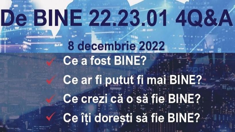 Evenimentul “De BINE 22.23.01 4Q&A” este organizat în data de 8 decembrie 2022, începând cu ora 18:00, în București, B-dul Dacia nr. 60.