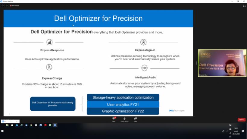 Noile stații de lucru Precision au fost ”vedetele” webinarului „Creativitate fără limite”, de marți, 28 aprilie, care l-a avut ca invitat principal pe Andrei Uhr – Product Specialist Dell Technologies. Timp de oră, Andrei a vorbit participanților despre performanțele acestor stații Precision, explicând în detaliu, pe fiecare componentă și sistem în parte, de ce pot fi considerate ele o unealtă indispensabilă pentru profesioniștii din numeroase domenii, precum: inginerie, manufactură, media, sănătate, finanțe, industrii creative etc.