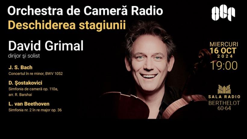 David Grimal interpretează pe o vioară Stradivarius din 1710 (denumită „Ex Roederer”). A absolvit Conservatorul din Paris și cariera sa a însemnat în ultimii 20 de ani concerte susținute ca solist alături de cele mai apreciate ansambluri ale lumii, ca Orchestre de Paris, Orchestre Philharmonique de Radio France, Berliner Symphoniker ș.a. Programul atractiv al serii cuprinde Bach – Concertul în re minor, Şostakovici – Simfonia de cameră (în aranjamentul semnat de R. Barshai)și Beethoven – Simfonia nr. 2.