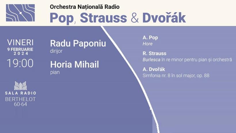 Cu acest prilej, îl veți revedea pe scena Sălii Radio și pe pianistul HORIA MIHAIL, solist al Orchestrelor și Corurilor Radio, care va interpreta Burlesca în re minor pentru pian și orchestră, semnată de compozitorul german RICHARD STRAUSS. Seara se va deschide cu Hore, lucrare creată de compozitorul ADRIAN POP, și se va încheia cu Simfonia a 8-a deDVOŘÁK, partitură dirijată la Praga, la premiera absolută din 2 februarie 1890, de compozitorul însuși.