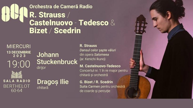 Alături de ORCHESTRA DE CAMERĂ RADIO, Dragoș Ilie va interpreta la Sala Radio Concertul nr. 1 pentru chitară și orchestră, creație a compozitorului italian MARIO CASTELNUOVO-TEDESCO, muzician prolific ce a compus o gamă variată de lucrări (partituri corale, concerte, operă, lucrări instrumentale, muzică pentru film) și care, după emigrarea în Statele Unite, a devenit profesor de compoziție al celor mai mari nume din lumea de film americană, inclusiv al celebrului compozitor John Williams.