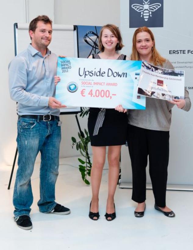 ”Upside Down” este un proiect de mediu ce are la bază conceptul de reciclare a unor materiale ce altfel s-ar transforma în deșeuri. Astfel iau naștere portofele din cutii de lapte, genți de damă din anvelope auto și multe altele. „Echipa Upside Down este recunoscătoare pentru participarea la Social Impact Award, deoarece ni s-a demonstrat că merită să visezi, să ai ambiție, să depui eforturi și să crezi până la capăt în propria idee. Acum, că am trecut de acest prim pas, suntem cu atât mai entuziasmați să implementăm ideea și să ne luăm în primire rolurile cu responsabilitate. Vrem să realizăm o competiție de design pentru produsele noastre, să începem să le vindem în cadrul târgurilor și în magazine micuțe pentru a lua feedback direct de la clienți și, astfel, să ne îmbunătățim atât produsul, cât și strategia. Ne dorim, de asemenea, să păstrăm legătura cu persoanele care ne-au sprijinit până acum și să mergem în vizite de învățare la sediile inițiativelor deja existente în România. Suntem încântați și ne bucurăm ca există inițiative precum SIA care oferă unor persoane ca noi șansa să pună în aplicare o idee”. Roxana Antochi, Upside Down