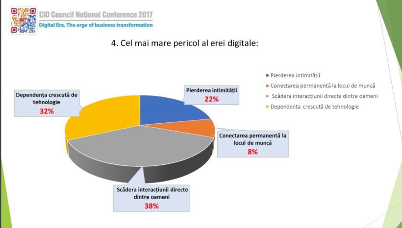 - Educația: Sistemul de învățământ românesc are mult de recuperat astfel încât să îi pregătească cu adevărat pe copii pentru piața muncii a viitorului. Cum multe meserii ce vor fi la mare căutare peste câțiva ani nu s-au inventat încă, nu este nevoie doar de o actualizare a materiilor predate, ci și de transformarea sistemului pentru ca elevul să își formeze de pe băncile școlii niște soft skill-uri cruciale (gândirea critică, capacitatea de învățare continuă, adaptabilitatea și abilitatea de a comunica eficient). Mai mult, ideea de educație merge până în vârful piramidei, căci și factorii de decizie din companii trebuie să înțeleagă noile tehnologii, precum și modul în care transformarea digitală afectează business-ul. De asemenea, și cei ce dețin funcția de CIO trebuie să învețe cum să comunice eficient și pe limba celor din board.