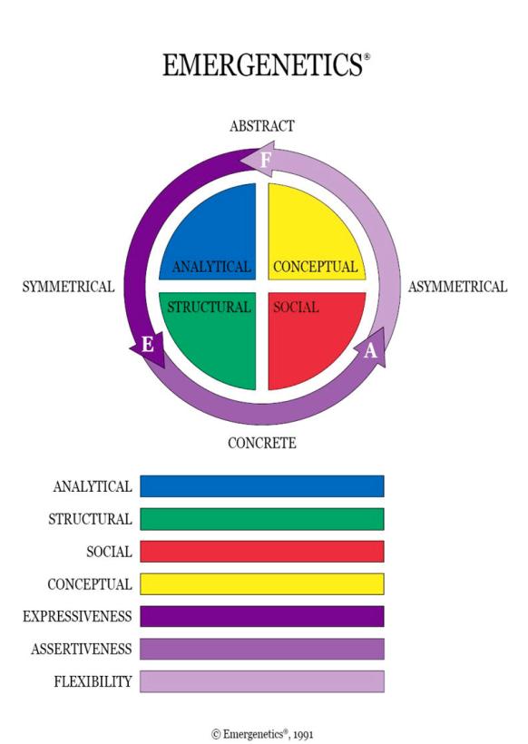 Emergenetics măsoară patru atribute de gândire (analitice, structurale, sociale, conceptuale), și trei atribute comportamentale (expresivitate, asertivitatea, flexibilitate). Cercetările au arătat că fiecare dintre noi prezintă aceste trăsături înmod variabil. Astfel, modul de gândire analitic reprezintă combinaţia dintre gândirea raţională şi ideile abstracte. Modul structural combină gândirea secvenţială cu ideile practice. Modul social este îmbinarea între gândirea intuitivă şi preocuparea pentru oameni, iar modul de gândire conceptual intersectează gândirea intuitivă cu ideile abstracte.