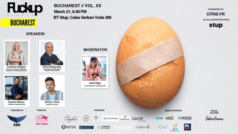 Felix Pătrășcanu - Cofondator & Managing Partner FAN Courier, Ciprian Stancu - Fondator Republica BIO, Cosmina Grigore - Coach & Fondator Originals & Asociația Imunis si Toma Costin Chiriac - însoțitor de zbor, relatează cum au întors eșecul în favoarea lor, remodelându-și astfel definiția succesului, la cea de a XX-a ediție a Fuckup Nights Bucharest (FUN).